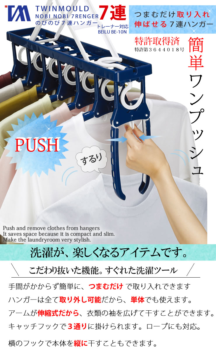 のびのび7連ガー 伸縮ハンガー BE-10N BEILU ブルー[ツウィンモール]押すだけ取り込み 横干し 縦干し 簡単 ワンタッチ 物干し 部屋干し ツインモール 洗濯ばさみ おしゃれ 花粉 梅雨【ポイント10倍】【e暮らしR】