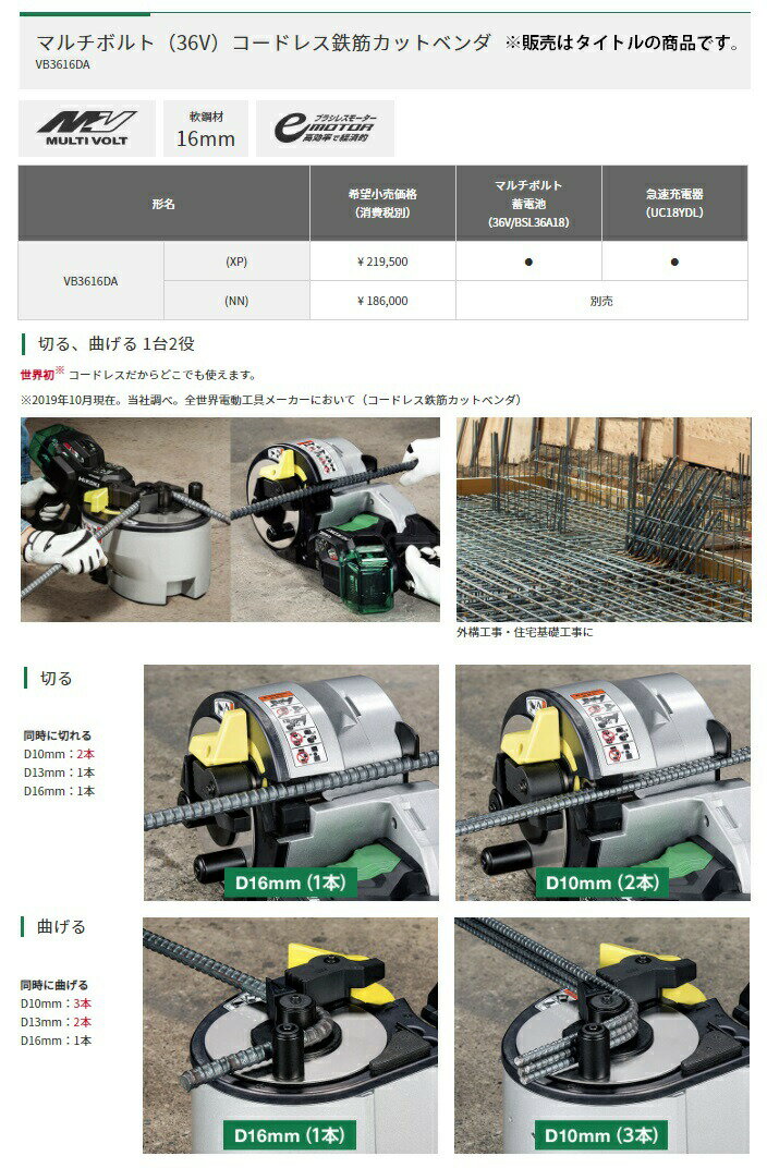 HiKOKI ハイコーキ (日立 HITACHI) マルチボルト(36V) 鉄筋カットベンダ VB3616DA ※従来の蓄電池(BSL3620、BSL3626、BSL3660 および BSL18XX、BSL14XXシリーズ)はご使用になれません。