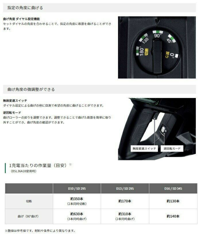 全世界電動工具メーカーにおいて(コードレス鉄筋カットベンダ) ・切る 同時に切れる D10mm:2本 D13mm:1本 D16mm:1本 ・曲げる 同時に曲げる D10mm:3本 D13mm:2本 D16mm:1本 ■指定の角度に曲げる 曲げ角度 ダイヤル設定機能 セットダイヤルの角度を合わせることで、指定の角度に鉄筋を曲げることができます ■曲げ角度の微調整ができる ・無段変速スイッチ ダイヤル設定による曲げの他に目測で希望の角度に曲げることができます。
