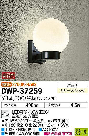 【最安値挑戦中!最大25倍】大光電機(DAIKO) DWP-37259 アウトドアライト ポーチ灯 ランプ付 非調光 電球色 防雨形 ブラック