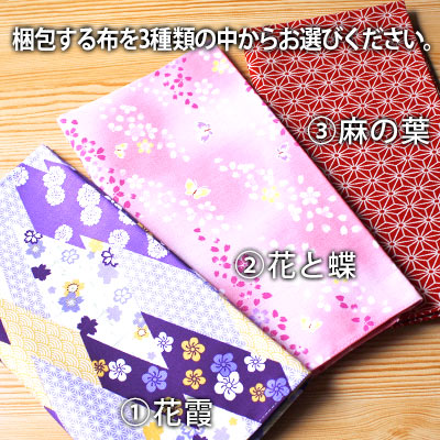 ギフト向けに包装布を3種類の柄(1:花霞 柄 / 2:花と蝶 柄 / 3:麻の葉 柄)から選べます。
