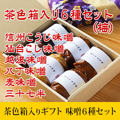 使いやすいベーシックなお味噌6種のセット ギフト用包装布つつみ 【茶色箱入り6種セット 梅】 信州こうじ味噌、仙台こし味噌、越後味噌、八丁味噌、麦味噌、三十七半(みそしちはん)と日常使いに喜ばれる6種類のお味噌が入った、ギフト向けのセットです。